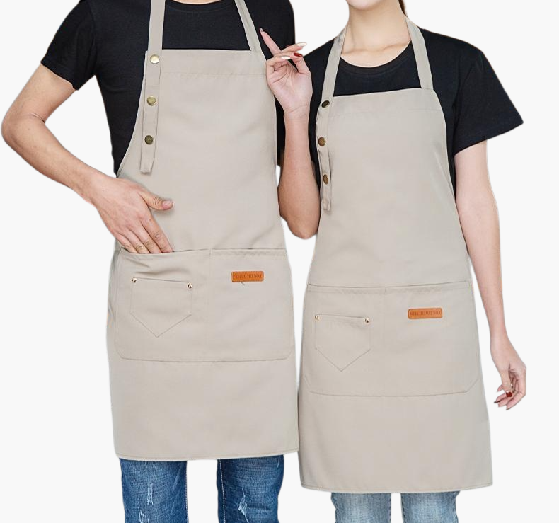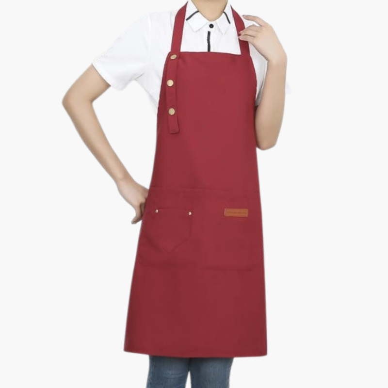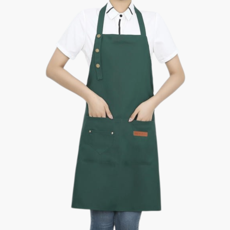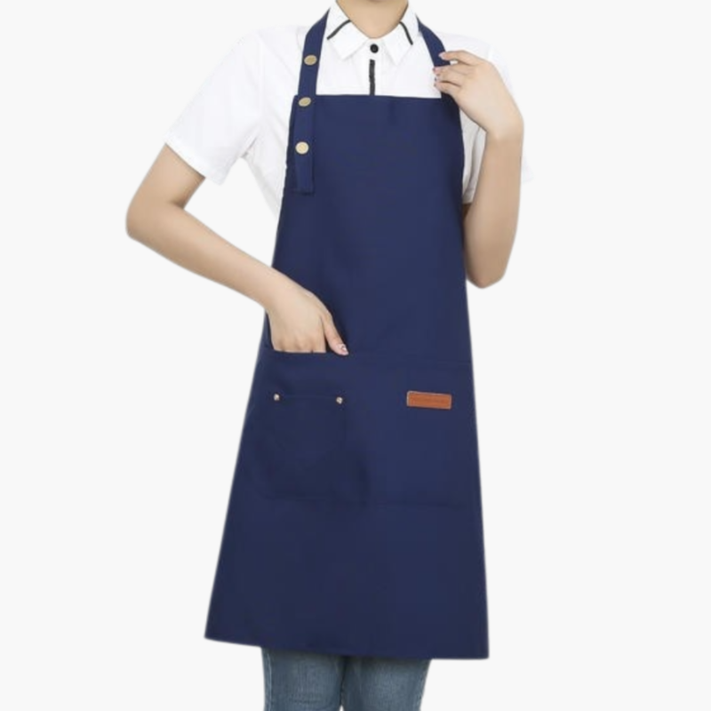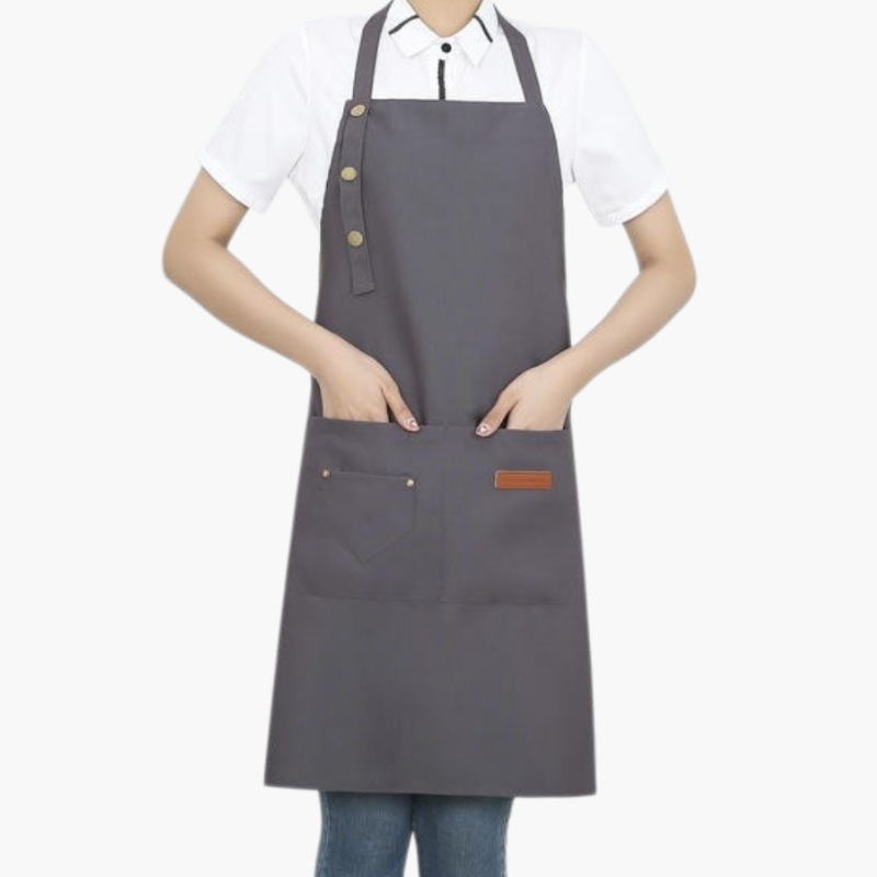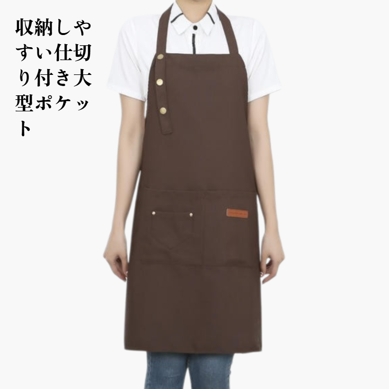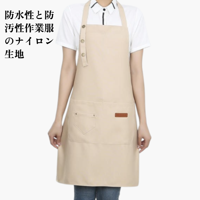 防水仕様で油や水をしっかりガード。調整可能なストラップと大きめポケット付き、快適な着用感。洗濯機対応でお手入れ簡単。